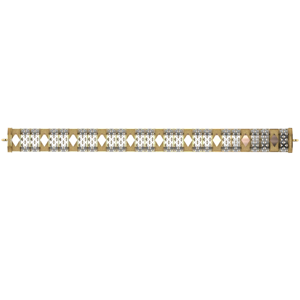 Широкая модель на запястье с широкими звеньями и выраженной фактурой в лаконичном стиле, с упором на полировку и ритм звеньев. Силуэт не перегружает образ и подходит для ежедневной носки. Ширина плетения делает акцент заметнее, но линия остаётся аккуратной.