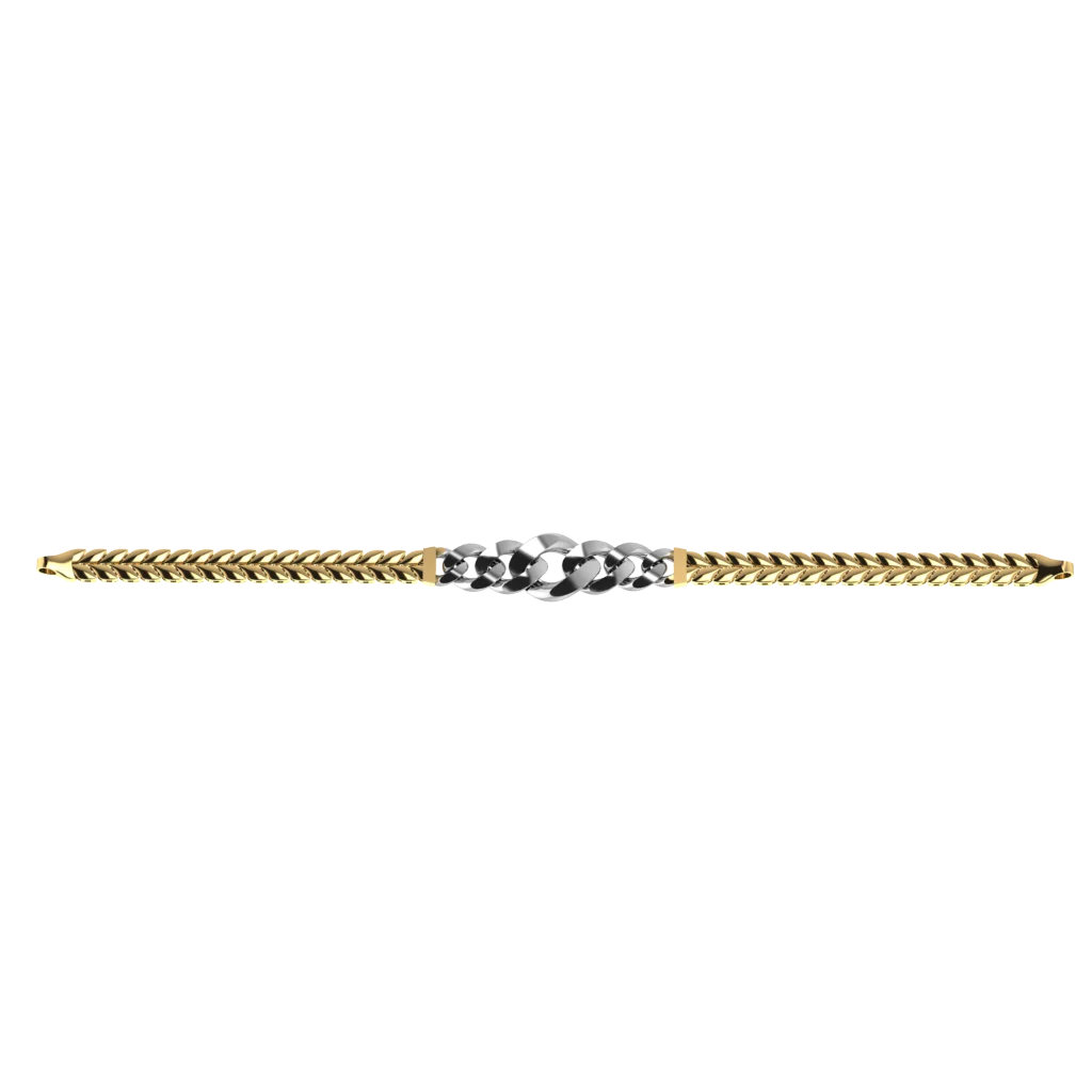 Браслет с цепочным плетением со звеньями средней толщины и уверенным блеском с тёмным акцентом, добавляющим графичность и глубину. Гибкая посадка даёт комфорт, а линия остаётся аккуратной и собранной.