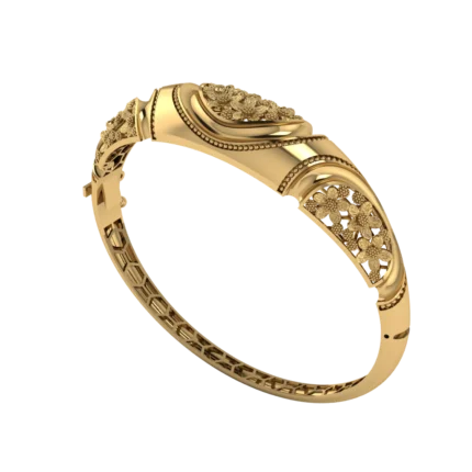 Широкий жёсткий обод с объёмной формой и сетчатым орнаментом внутри с вставками камней, которые подчёркивают узор и дают мягкий блеск. Форма смотрится собранно, а резной рисунок добавляет воздушность.