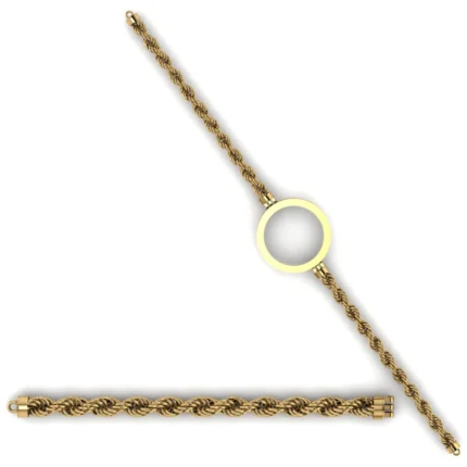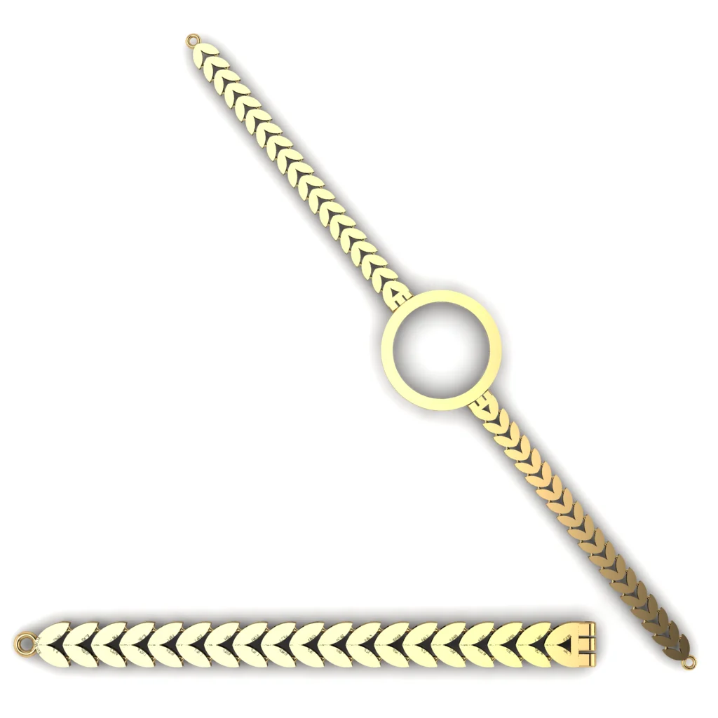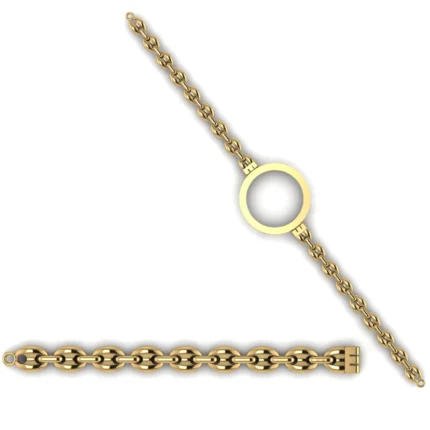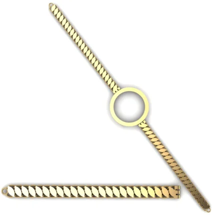 Гибкая модель с звеньями с ровным ритмом звеньев и аккуратной геометрией и вставкой паве, добавляющей деликатный блеск. Силуэт выглядит собранно, а конструкция остаётся лёгкой и пластичной. Полировка подчёркивает золото и добавляет мягкие блики по всей линии.