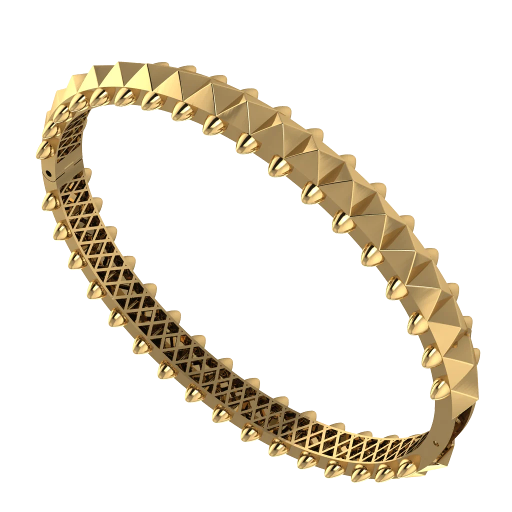 Браслет с пирамидальной фактурой по всему ободу: гранёные выступы дают выразительный ритм. Золотая основа и ажурная внутренняя часть делают массивный вид легче и воздушнее.