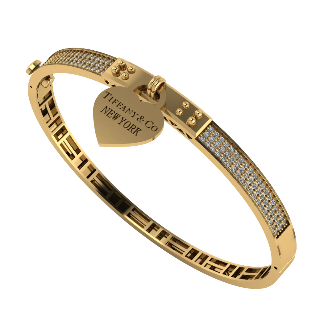 Браслет с сердечной подвеской и декоративной планкой у застёжки. По дуге проходит плотная дорожка камней, а золотые детали с шариками добавляют фактуру и мягкий блеск.