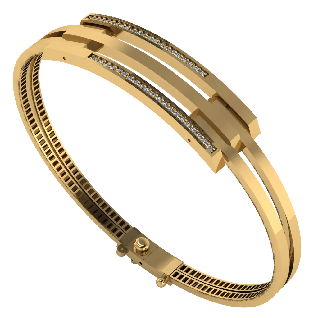 Браслет из двух параллельных дуг, соединённых верхней планкой с дорожкой камней по обеим сторонам. Конструкция выглядит воздушно, а золото и блеск вставок дают нарядный акцент.