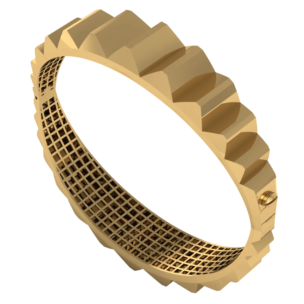 Браслет с зубчатым рельефом по внешней кромке и сетчатой боковой частью. Такой шестерёнчатый профиль выглядит смело, а полированное золото усиливает игру света на гранях.
