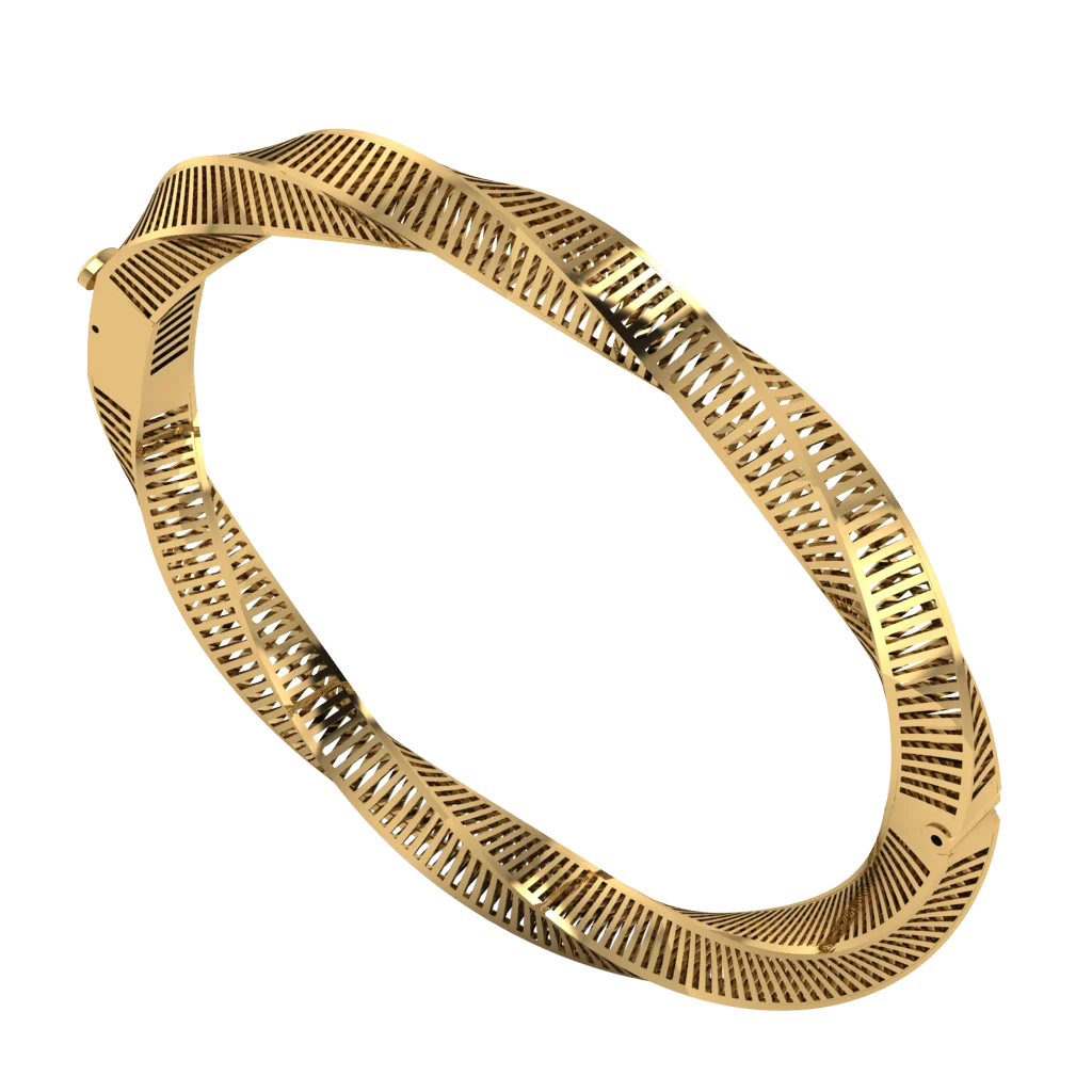 Браслет с тонкой диагональной штриховкой и графичным рельефом по всей дуге. Текстура создаёт мягкие переливы, а золото выглядит особенно выразительно благодаря игре света на линиях.
