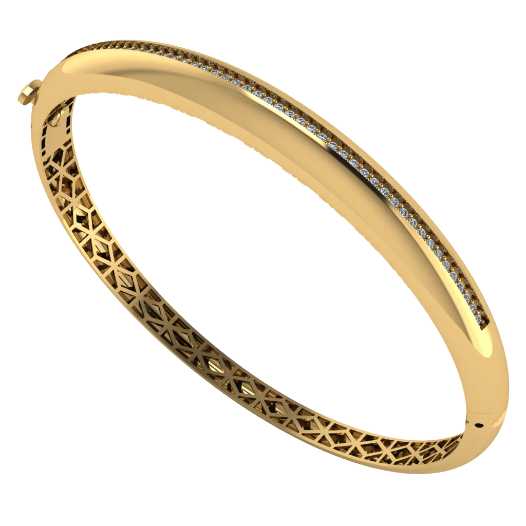 Браслет с длинной дорожкой камней по верхней линии и мягкой выпуклой формой. Внутренний треугольный ажур добавляет воздуха, а чистая полировка делает акцент спокойным и элегантным.