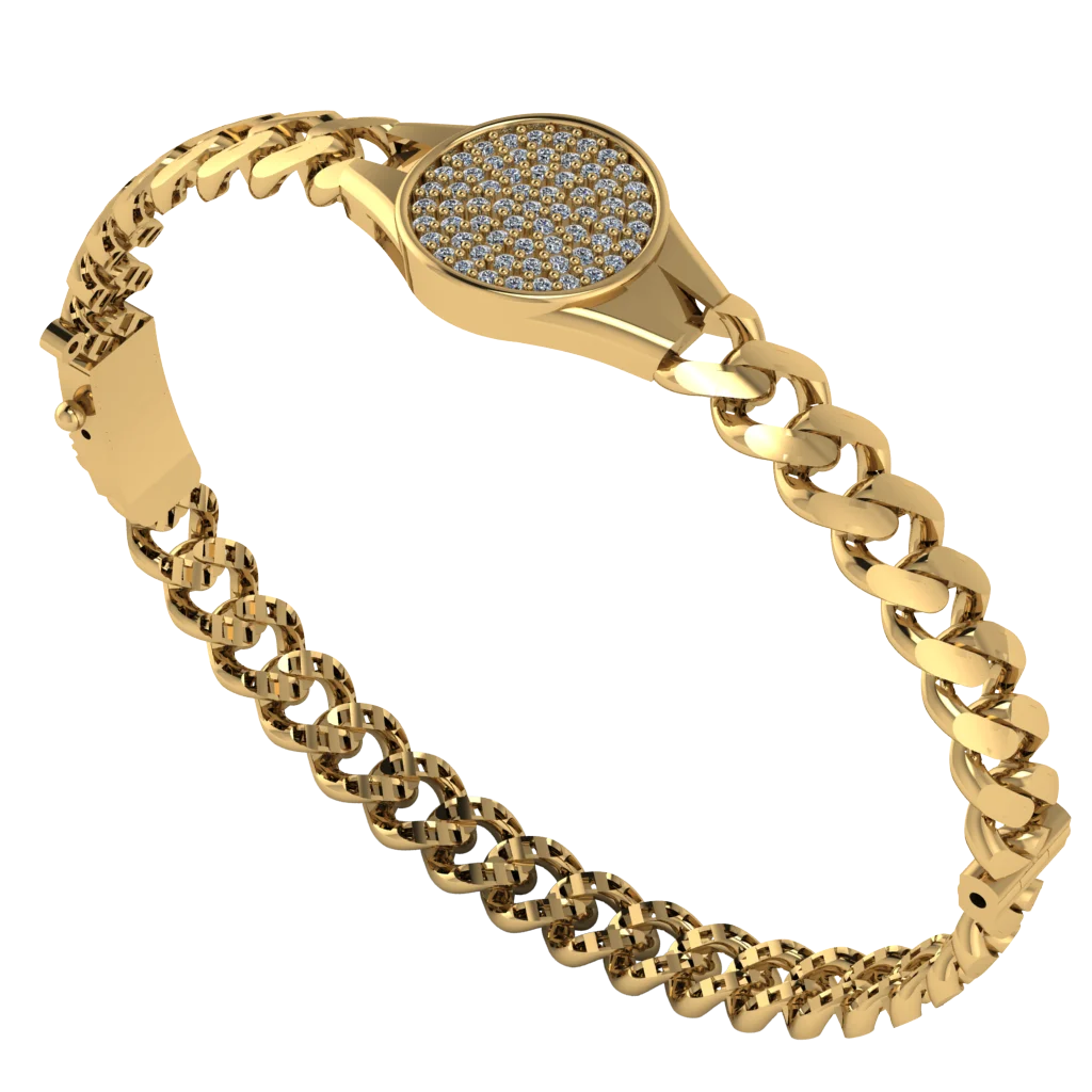 Браслет с крупной цепью и круглой площадкой с плотной россыпью камней. Вторая половина выполнена ажурным плетением, поэтому блеск акцента уравновешен лёгкой сетчатой фактурой по окружности.