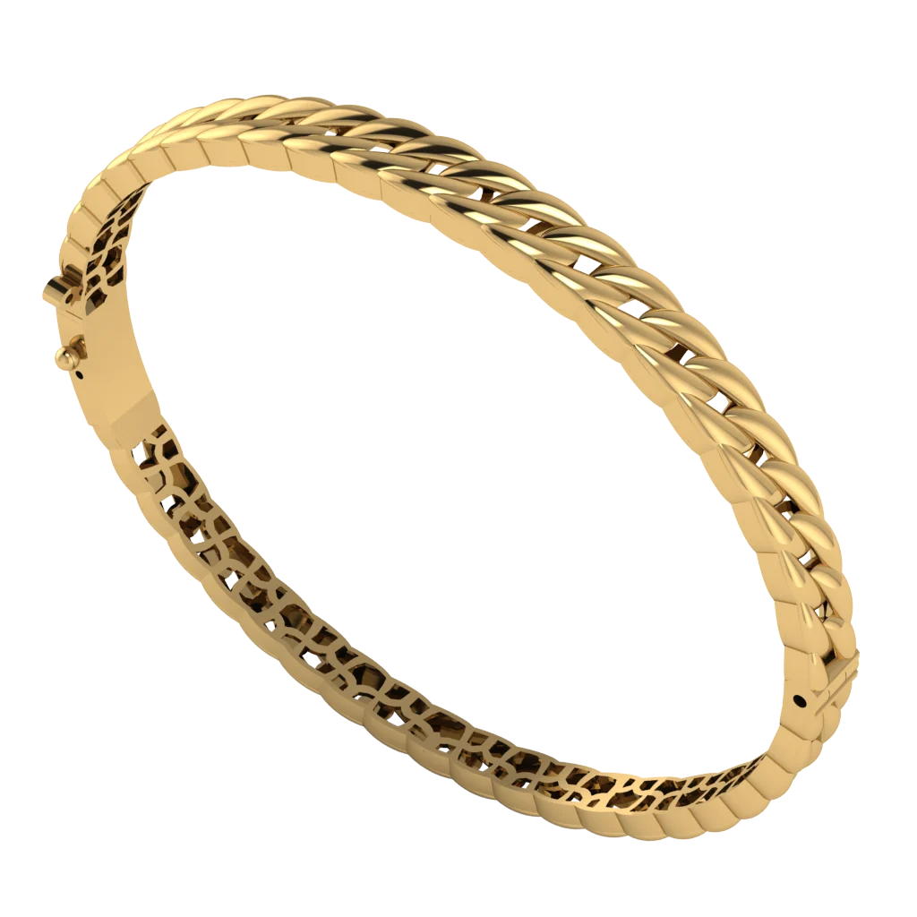 Браслет с оплёткой в виде косички по внешнему краю и ажурной решёткой на внутренней стороне. Объёмный рельеф даёт глубокие переливы, а лёгкий рисунок внутри делает силуэт воздушнее.