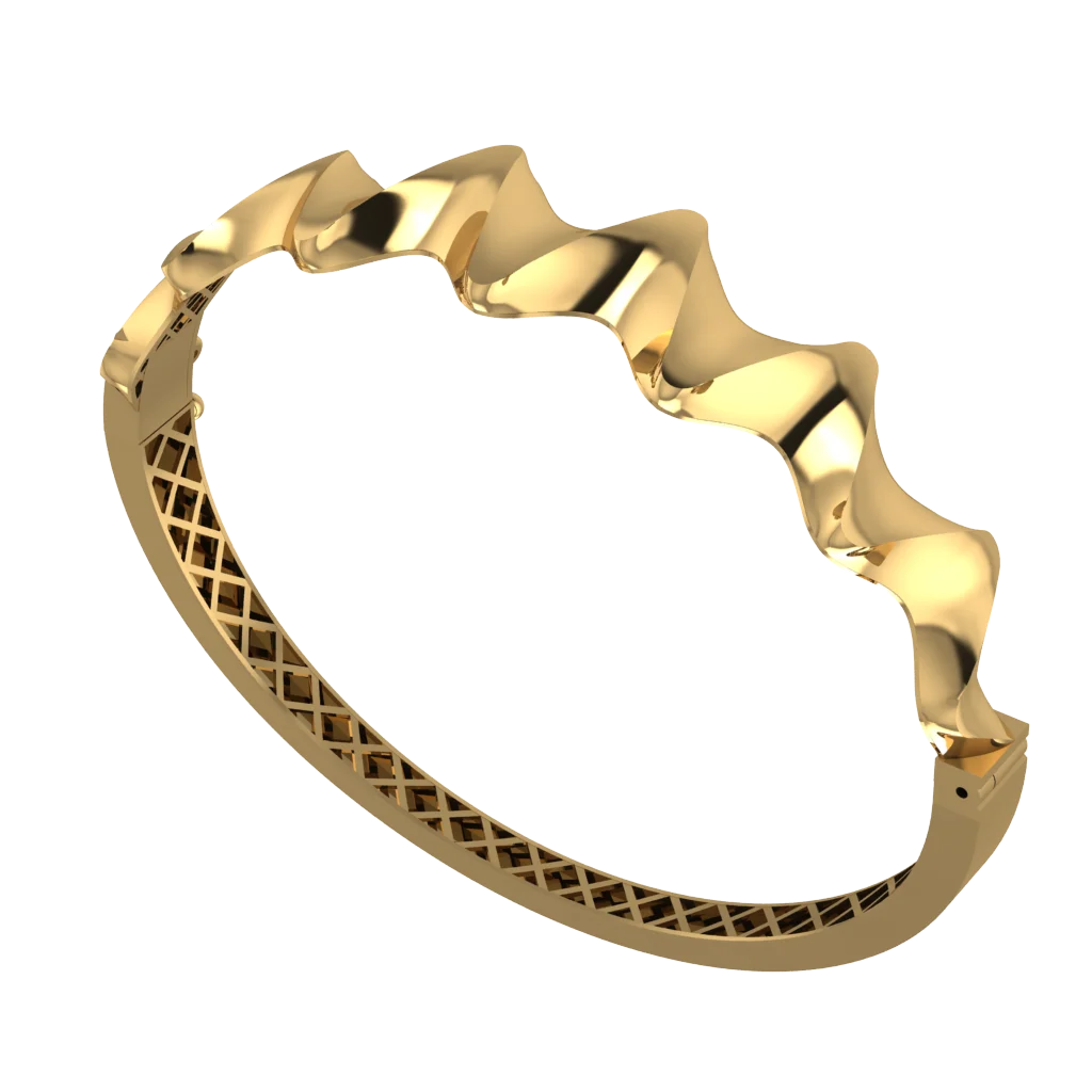 Гладкий браслет с волнистой верхней линией, будто металл мягко потёк по форме. Чистая полировка подчёркивает изгибы, а внутренний рисунок сохраняет ощущение лёгкости и комфорта.