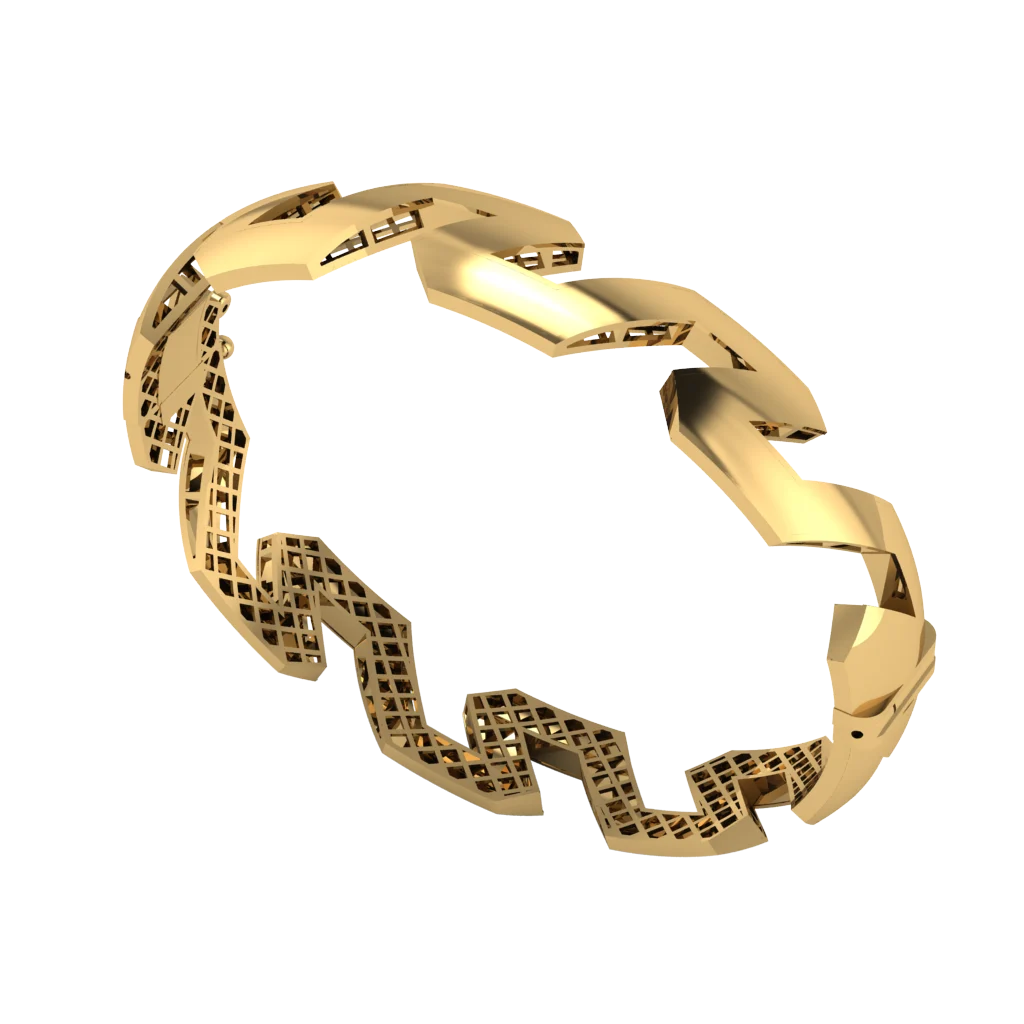 Широкий обод с перфорацией и строгими линиями и несколькими вставками камней, расставленными по ритму. Перфорированная внутренняя часть смягчает массивность и подчёркивает форму. В золоте это сияние выглядит особенно тёплым и собранным.