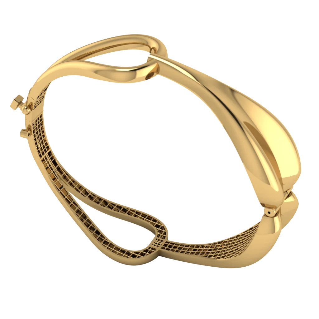 Гладкий браслет с крупными сегментами с мягкими переходами и ровной дорожкой мелких камней по верхней линии. Внутренняя решётка облегчает конструкцию, поэтому объём не выглядит тяжёлым. Акцент смотрится аккуратно и подчёркивает современный характер дизайна.