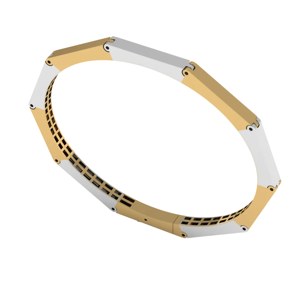 Браслет с ритмом звеньев с плетёной фактурой и ровным силуэтом и тонкой полосой камней вдоль кромки. Лёгкая внутренняя структура поддерживает комфортную посадку и чистый силуэт. Акцент смотрится аккуратно и подчёркивает современный характер дизайна.