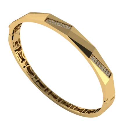 Фасетный обод с гранями, которые ловят свет при движении и тонкой полосой камней вдоль кромки. Лёгкая внутренняя структура поддерживает комфортную посадку и чистый силуэт. Акцент смотрится аккуратно и подчёркивает современный характер дизайна.