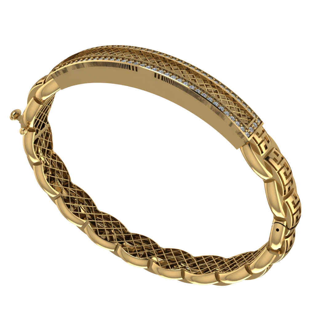 Комбинированная модель с выраженной фактурой и прямоугольными окнами и строгим ритмом секций. Лёгкая внутренняя структура поддерживает комфортную посадку и чистый силуэт. Рельеф делает украшение живым и хорошо читаемым на руке.