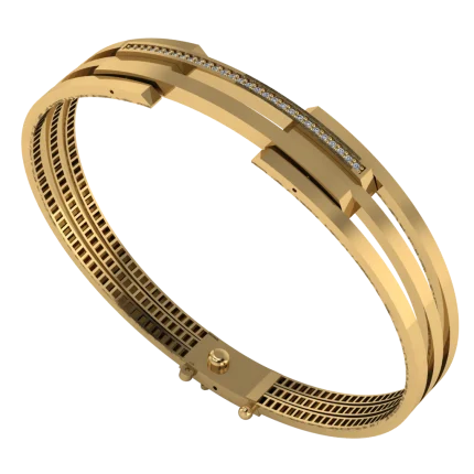Архитектурный браслет с жёсткой дугой и чистой полировкой и несколькими вставками камней, расставленными по ритму. Перфорированная внутренняя часть смягчает массивность и подчёркивает форму. Акцент смотрится аккуратно и подчёркивает современный характер дизайна.