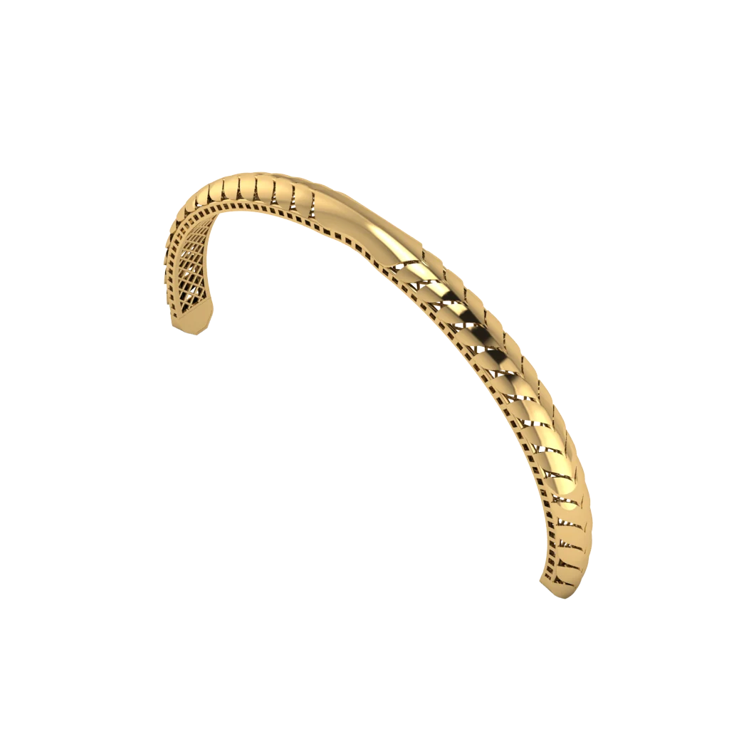 Открытый браслет-полукольцо с открытой посадкой и чистой геометрией дуги и тонкой окантовкой, добавляющей глубину с небольшими камнями как светлыми акцентами по линии. Разомкнутый силуэт делает украшение лёгким визуально и удобным в носке.