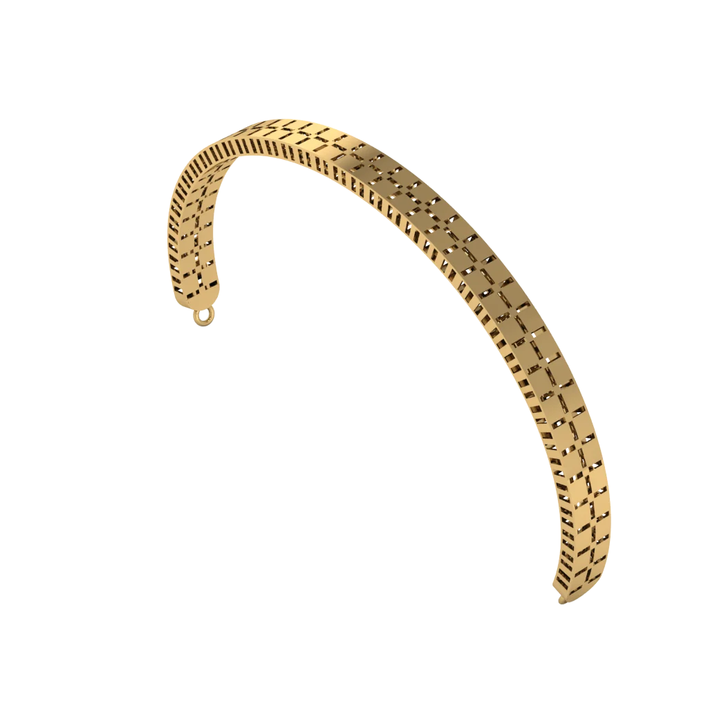 Жёсткий браслет полукольцом с плавной дугой, которая подчёркивает форму запястья и заметным рельефом на верхней части без ярких вставок, где акцент строится на форме и блеске. Полукольцо выглядит аккуратно и не перегружает образ лишними деталями.