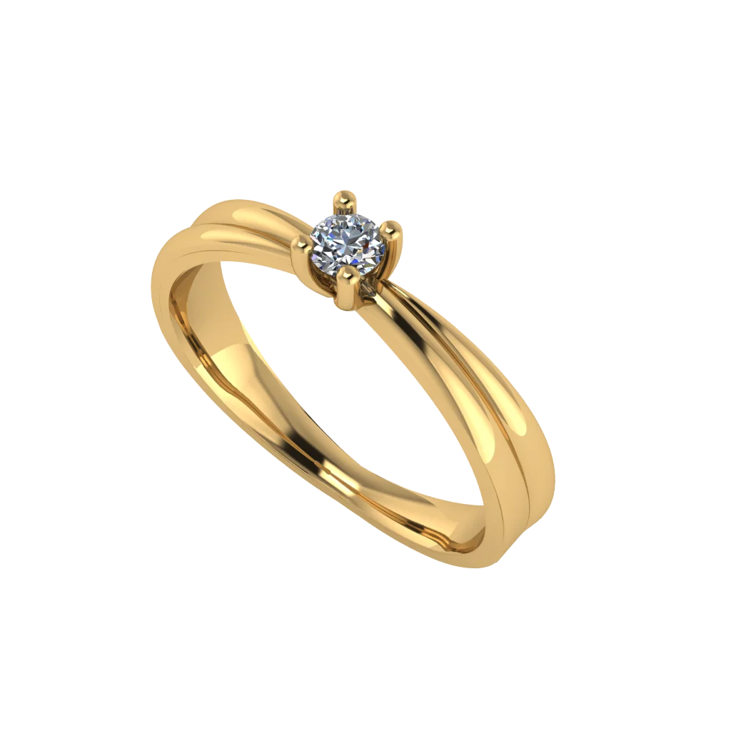 Центральный камень поднят в мягко расширенной шиной и цветочной короной: верх выглядит лёгким, камень приподнят, а тёплым золотом подчеркнуты гладкие кромки, создающие чистый контур и аккуратный блеск.