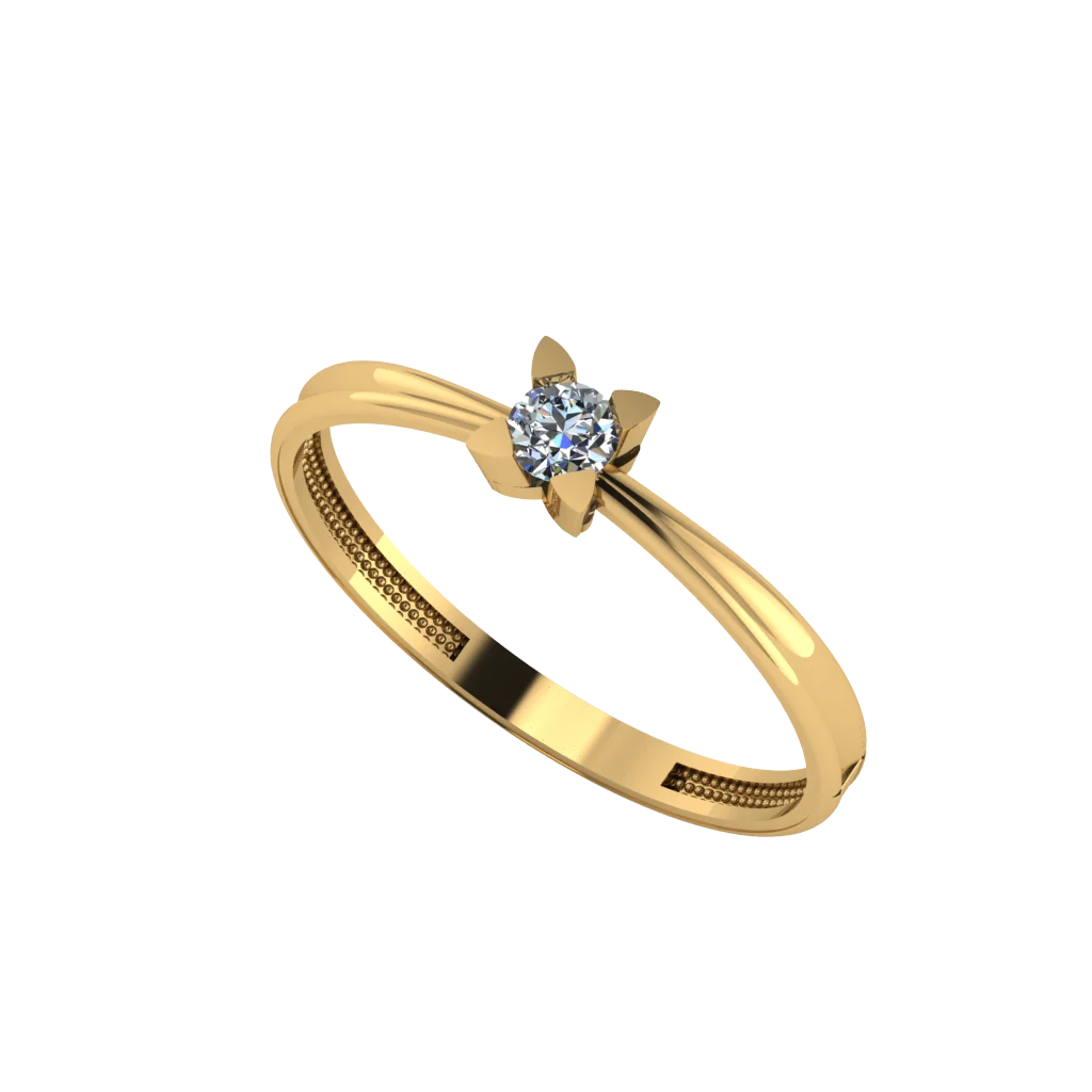Гладкие плечи подчёркивают минималистичный солитер с тонкой шиной и цветочной короной: верх лёгкий, камень сияет чисто, а полировка в золоте создаёт мягкие отражения, подчёркивая изящный повседневный характер.