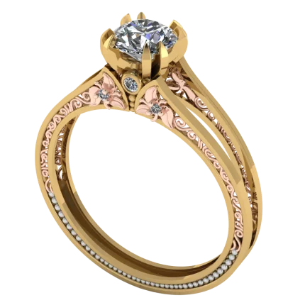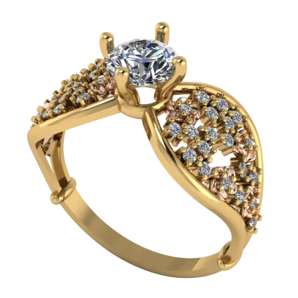 Прозрачный камень в классической посадке сочетается с ажурным плечом и тонкими боковыми камнями: витой рисунок оправы делает верх лёгким, а полировка золота добавляет чистые зеркальные блики.