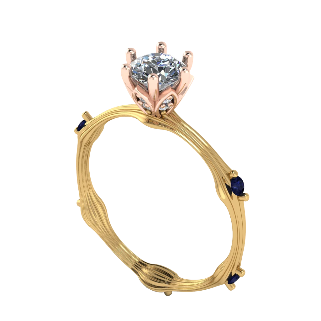 Минималистичная модель с прозрачным центральным камнем и маленьким тёмно-синим акцентом на шине: тонкий профиль выглядит легко, а сочетание чистой огранки и цвета делает украшение современным.