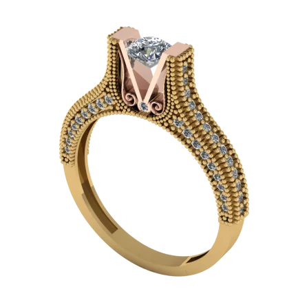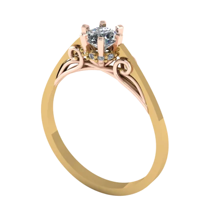 Тройная шинка образует плавный узел, поддерживая прозрачный камень, а по бокам видны нежные розовые вставки: сочетание объёма и тонких деталей создаёт романтичный образ в тёплом золоте.