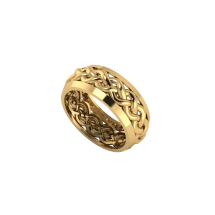 Ободок с плотным геометрическим орнаментом и мелкими прорезями, создающими фактуру: верх чуть приподнят, форма массивная, а тёплое золото и полировка делают рисунок чётким и выразительным.