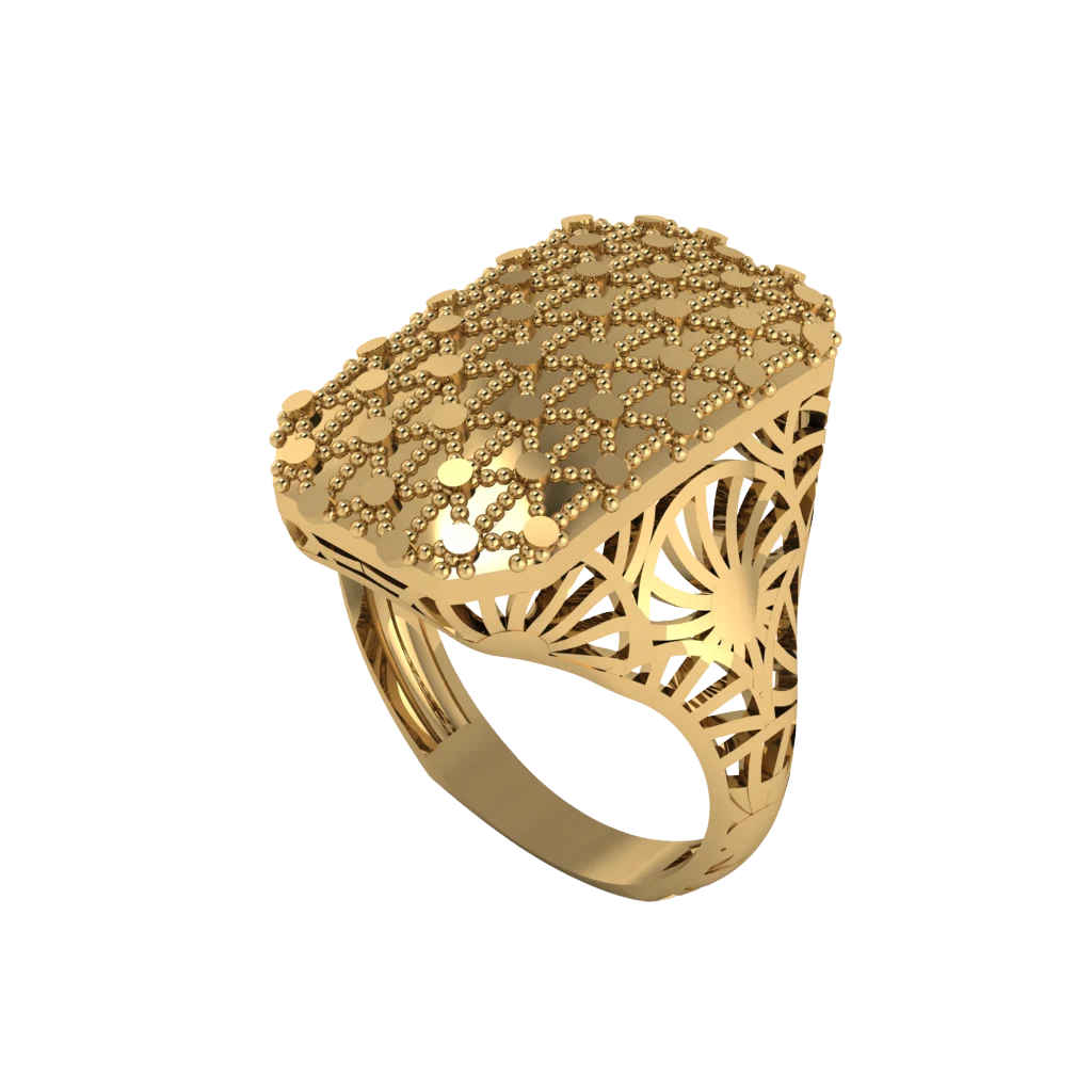 Крупное золотое кольцо с широкой фактурной площадкой и ажурными боковыми узорами. Женский арабский стиль подчёркивает декоративность и объём украшения.