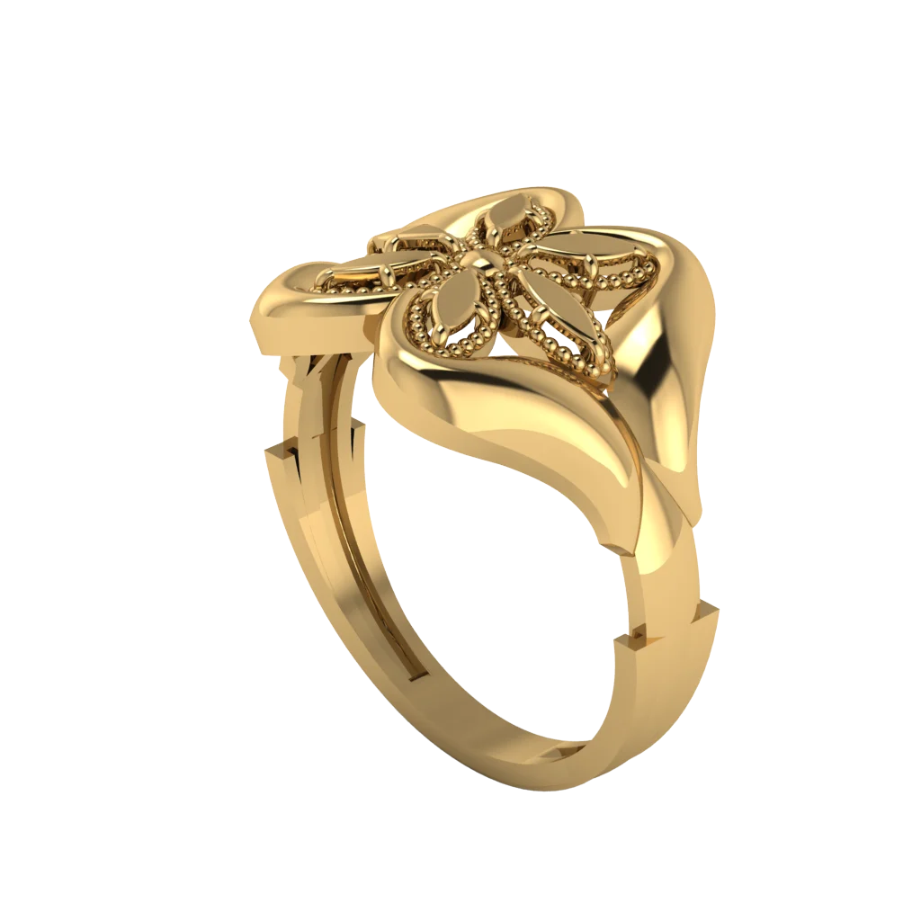 Изящное кольцо в арабском стиле с открытым цветочным элементом и тонкой посадкой. Золотой блеск подчёркивает лёгкость формы и женственный характер модели.