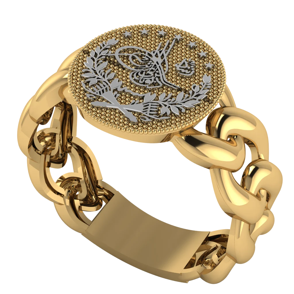 Крупная золотая модель с круглой площадкой, фактурным серебристым рисунком и боковыми цепными элементами. Украшение выглядит смело, декоративно и очень эффектно.