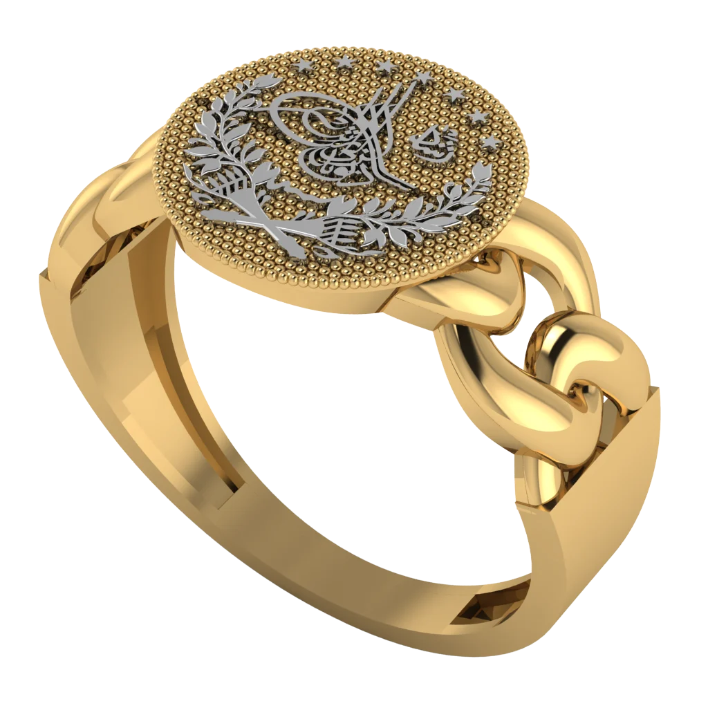 Женское кольцо из золота с круглым верхом и серебристым орнаментом в центре. Контрастная площадка подчёркивает арабский характер дизайна и добавляет модели выразительности.