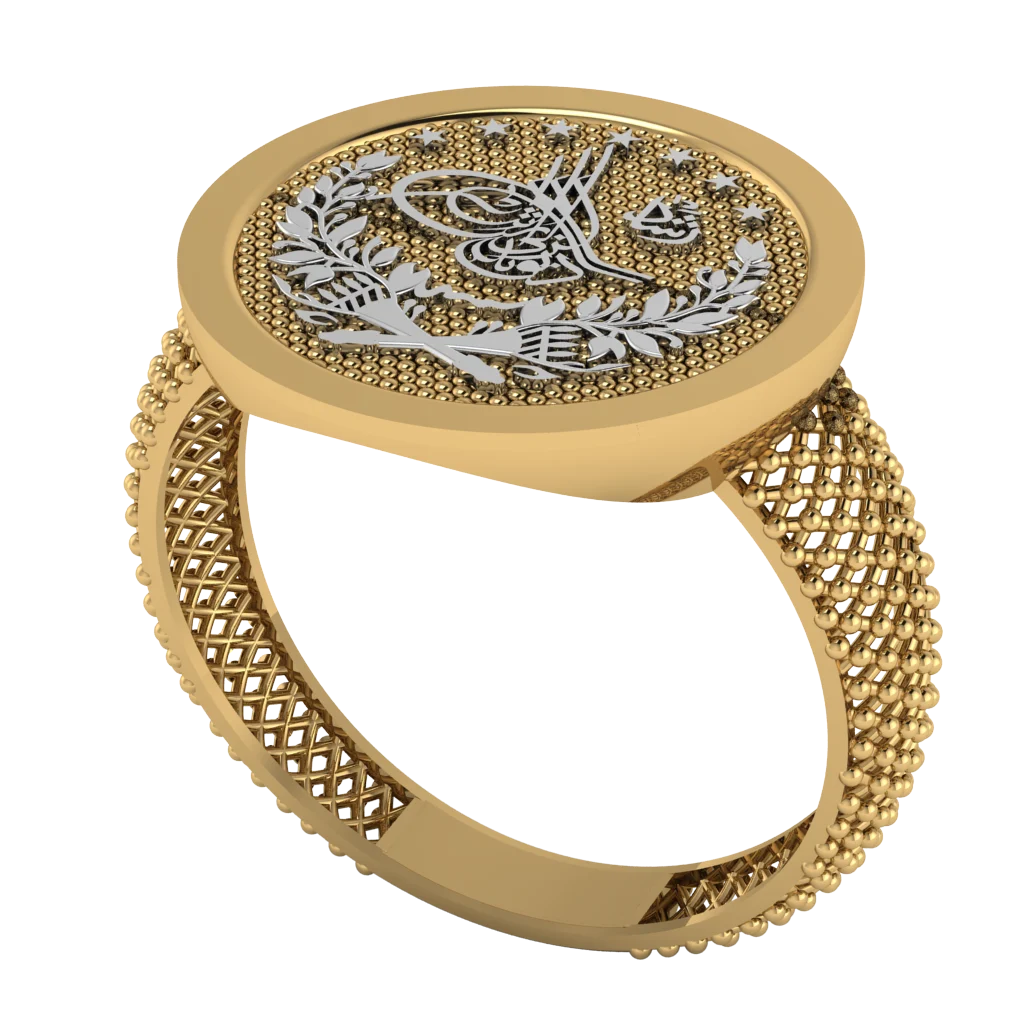 Золотая модель с широкой круглой площадкой, серебристым рисунком и объёмной шинкой с сетчатым рельефом. Кольцо смотрится нарядно, статусно и очень самобытно.