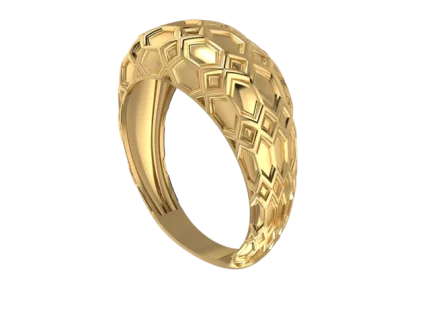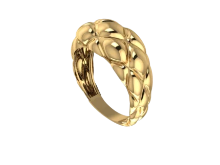Фактурная поверхность задаёт характер: широкая шинка собрана из крупных сегментов, напоминающих мягкие звенья, а тёплое золото в полировке подчёркивает объём и чёткий ритм граней.