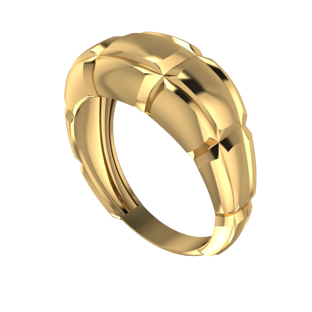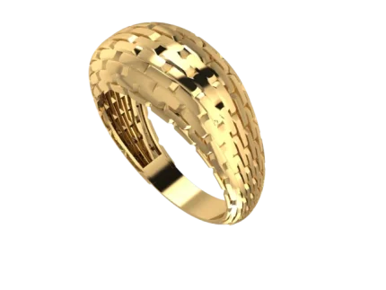 Плавные ленты на шине образуют мягкий объёмный узел, где линии сходятся к вершине и создают динамику; тёплое золото подчёркивает скульптурность и даёт чистые отражения на изгибах.