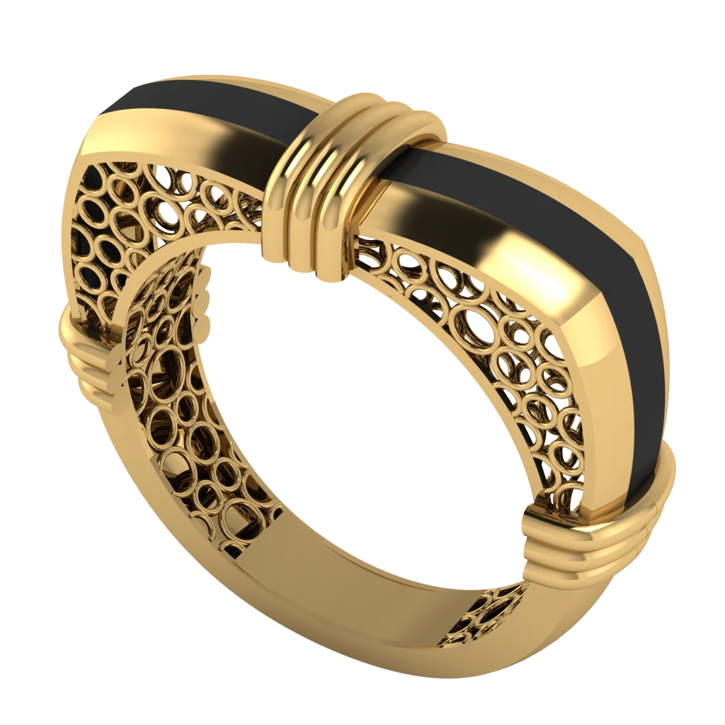 Широкое кольцо с черной полосой и декоративным переплетом — выразительный контраст и премиальный вид.