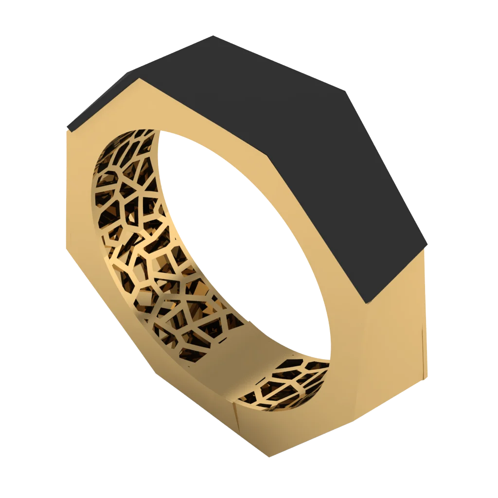Кольцо с широкой черной площадкой и золотым контуром — минимализм, который выглядит дорого и строго.