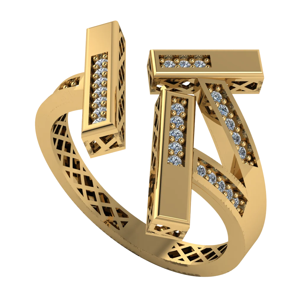 Кольцо с вертикальными планками и паве-акцентами — строгая графика, будто мини-небоскребы на пальце.