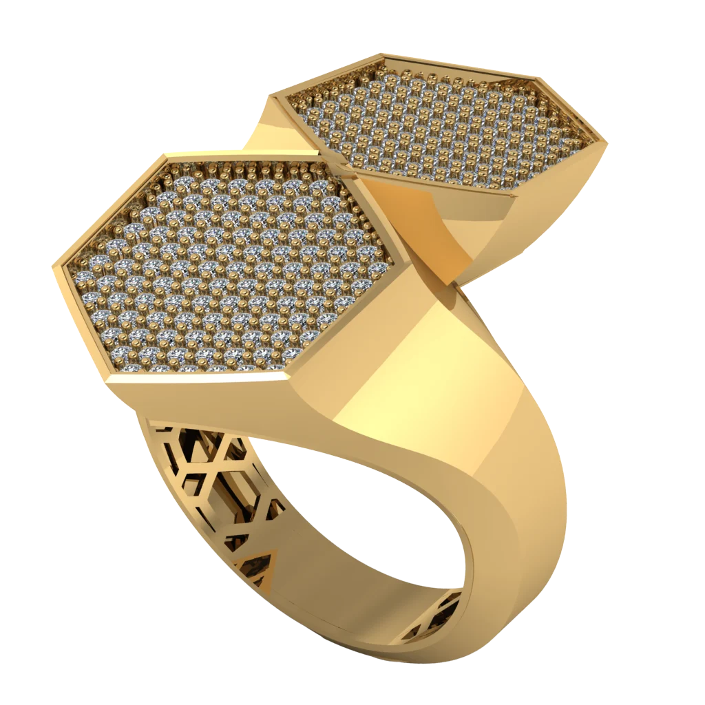 Кольцо с двумя шестиугольными площадками паве — модная геометрия, многогранный блеск.