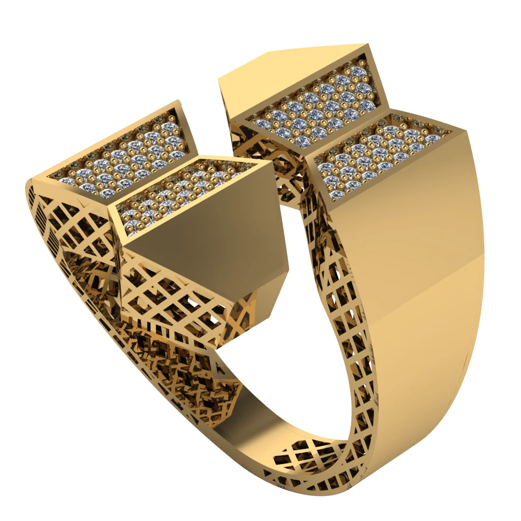 Печатка с двумя кубическими элементами и россыпью камней — 3D-геометрия и сверкающий контраст.