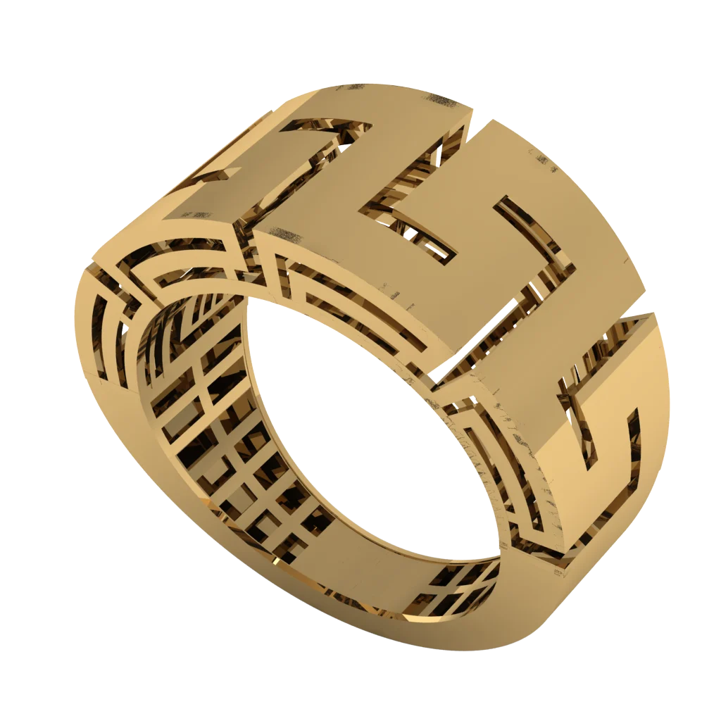 Широкое кольцо с прорезями и архитектурным узором — графика, объем и ажурная внутренняя структура.