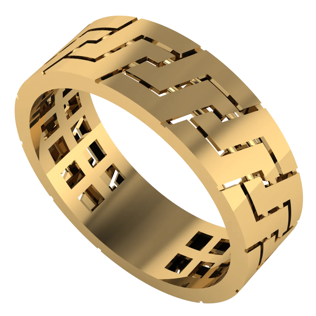 Кольцо с повторяющимся узором «лабиринт» — ритмичная графика, гладкий глянец и выразительная ширина.