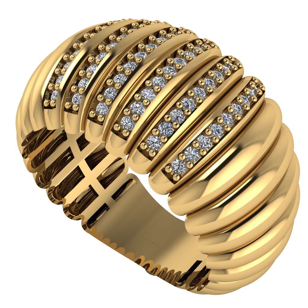 Широкое рельефное кольцо с тремя продольными дорожками камней — эффектная фактура и сияние.