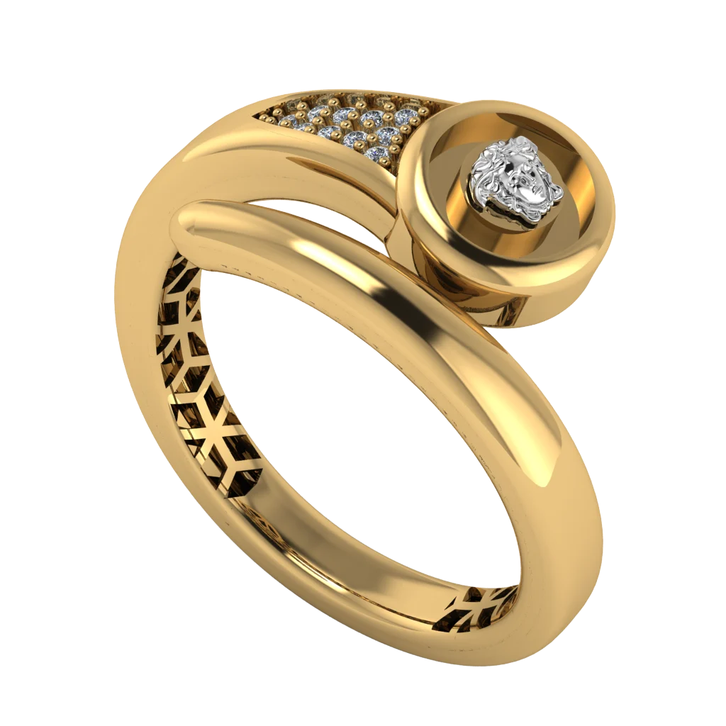 Кольцо-спираль: круглая площадка с камнем и паве на верхней дуге, внутри ажур — мягкая динамика и блеск золота.