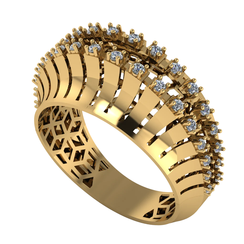 Широкое кольцо с ребрами и двумя линиями камней — рельефный объем и заметный блеск без лишнего.