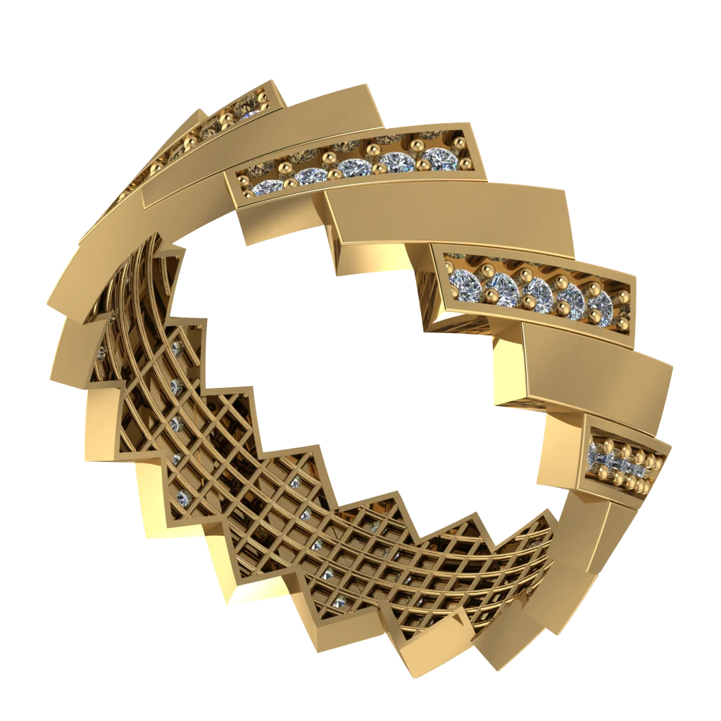 Широкое кольцо со ступенчатым «зубчатым» рельефом и ажуром — дерзкая форма и воздушная основа.