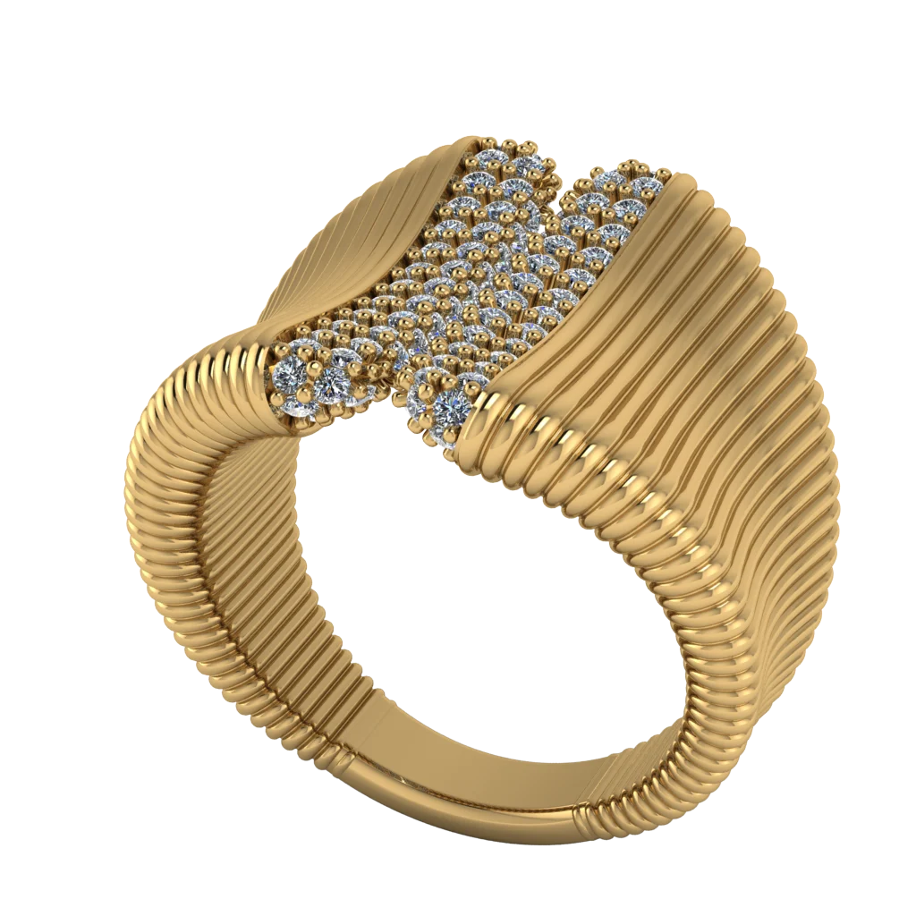 Кольцо с ребристой шинкой и паве-вставкой в виде капли — динамика линий и сияние.