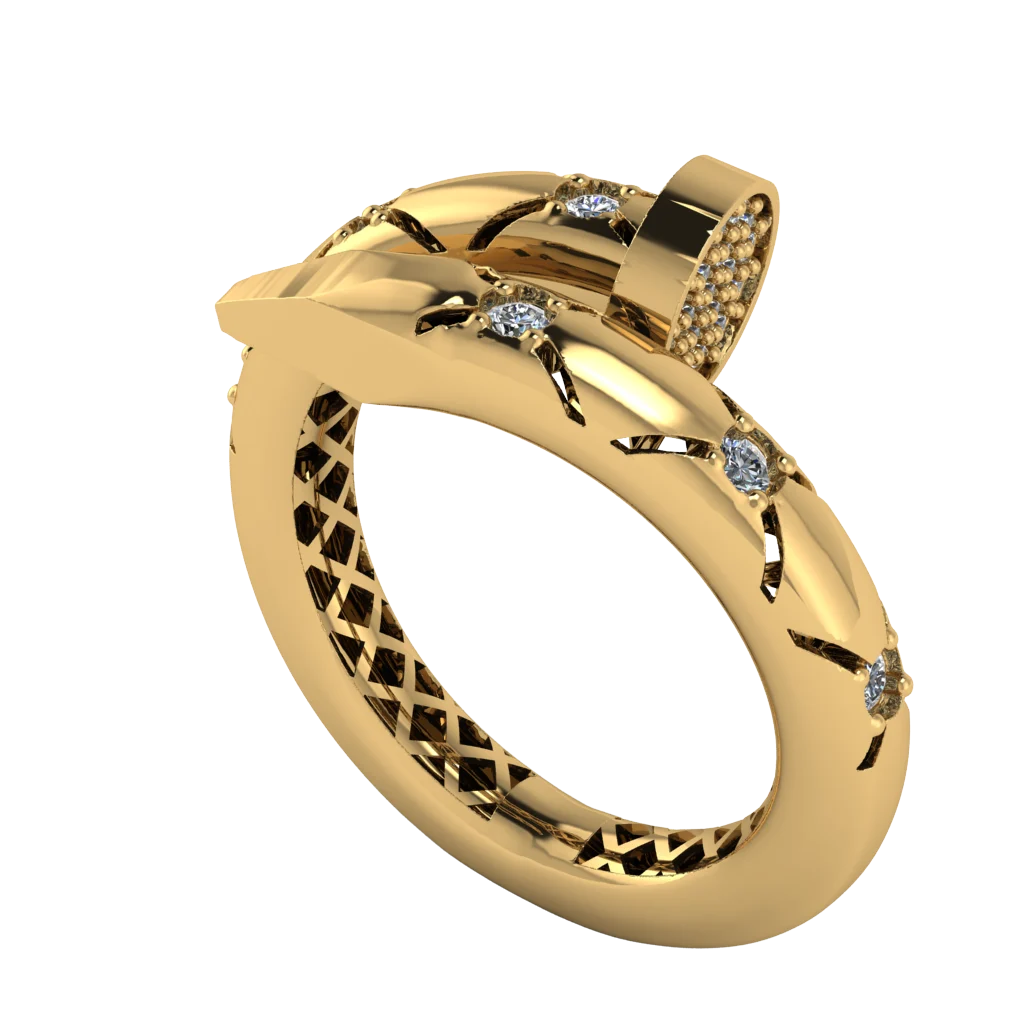 Открытое кольцо с камнями по верхней дуге — легкая асимметрия и мягкое сияние.