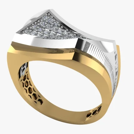 Две широкие дуги сходятся в узел, при этом одна покрыта плотной россыпью мелких камней: объёмная форма выглядит нарядно, а золото и рельеф создают яркую игру света по верхней линии.