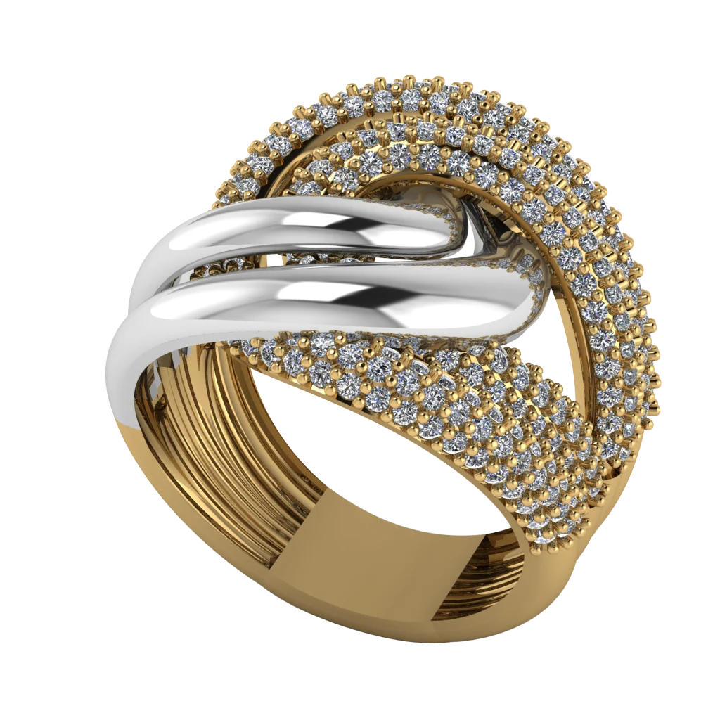 Широкий узел с плотной дорожкой мелких камней и светлой гладкой вставкой в центре: ленты перекрываются и создают объём, а тёплое золото по бокам подчёркивает контраст сияния и полировки.
