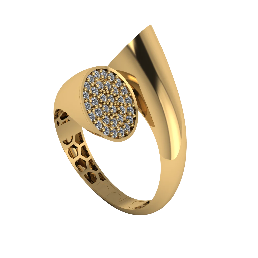 Минималистичный силуэт с овальной площадкой паве, установленной сбоку на плавной шинке; гладкая поверхность отражает свет, а аккуратная россыпь камней подчёркивает современную линию золота.